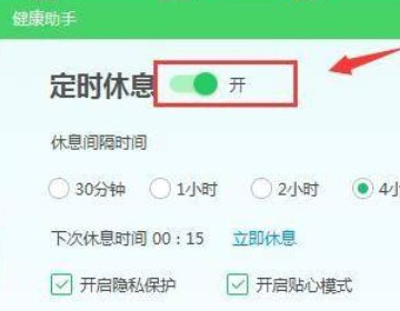 5、最后在打开的窗口中,如果想关闭屏保,可以点击【定时休息】后边的开关切换按钮。